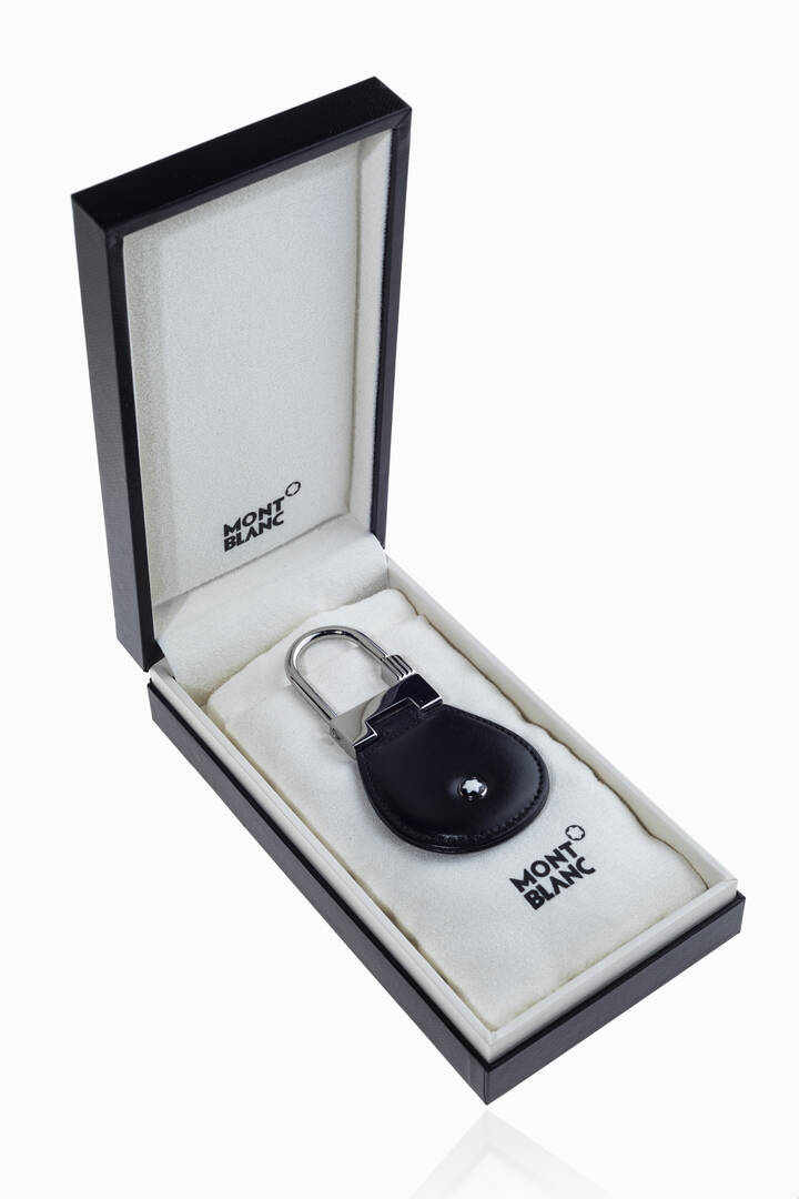 Portachiavi Montblanc in metallo e cuoio nero con emblema della maison Corredata di scatola e libretto