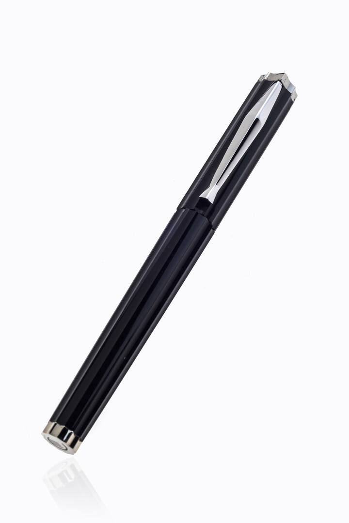 Stilografica firmata Cleto Munari. Corpo e cappuccio in resina nera con scanalature. Particolari argentati