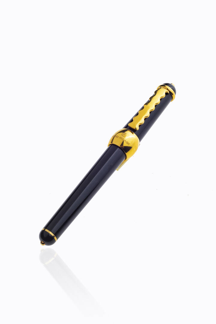 Stilografica firmata Cleto Munari modello Faro. Corpo e cappuccio in metacrilato nero. Particolari dorati Corredata di scatola