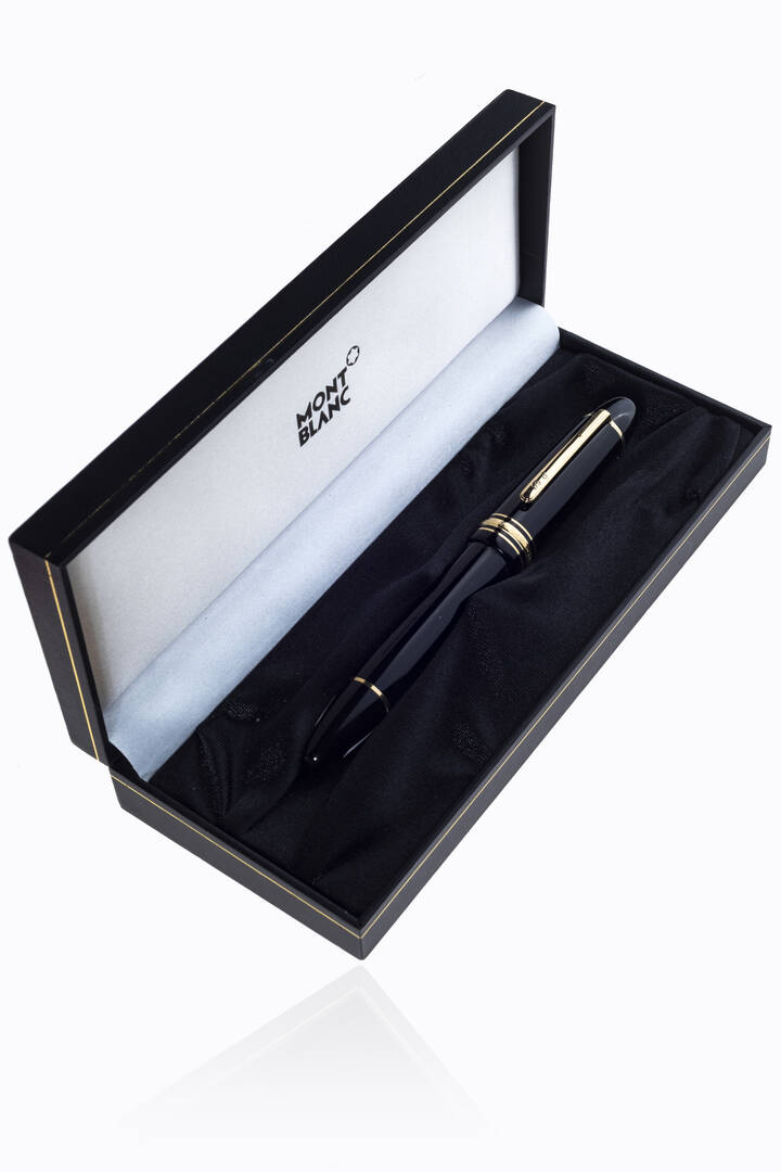 Stilografica Montblanc modello Meisterstück . Corpo e cappuccio in resina nera con l’emblema Montblanc bianco intarsiato nella parte superiore del cappuccio. Pennino in oro giallo 14 Kt Corredata di scatola