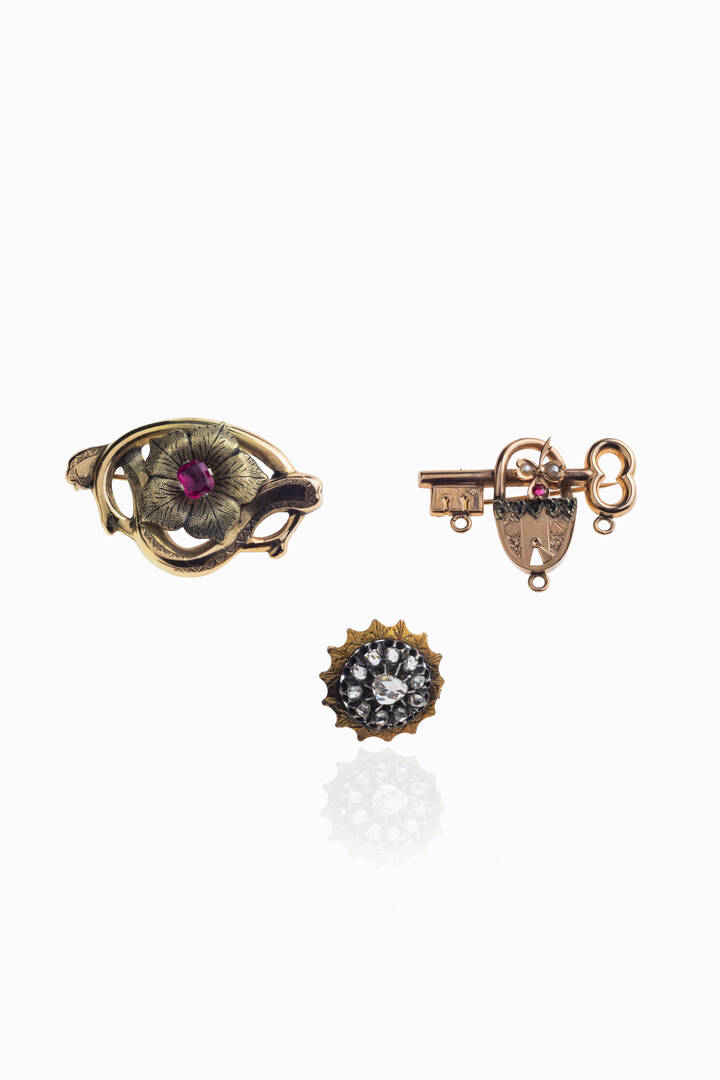 XIX secolo in oro a bassa caratura ed argento -a forma di voluta lavorata a canna vuota al centro fiore con gemma rossa sintetica. Peso gr 5 3 -a forma di lucchetto con chiave e un trifoglio tremblant; decorata con perline e un rubino sintetico. Peso gr 5 -di forma rotonda con rosette di diamante per totali ct 0 80 ca. Peso gr 4