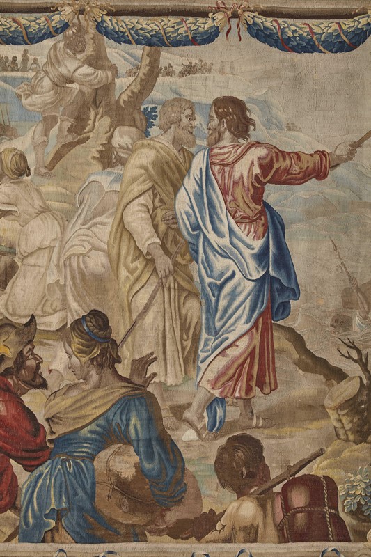 L’arazzo raffigura il Passaggio del Mar Rosso, uno dei più noti episodi dell’Antico Testamento che racconta la fuga degli Israeliti dall’esercito egiziano attraverso la divisione delle acque del Mar Rosso da parte di Mosè. La composizione, incorniciata da festoni vegetali, ghirlande di fiori e due erme sorreggenti vasi di florida frutta, alla cui base poggiano due variopinti pappagalli, mostra il momento in cui Mosè protese il bastone verso l’esercito del Faraone che fu travolto dai flutti del mare, mentre sulla riva si vede in lontananza il popolo israelita proseguire l’esodo nel deserto e verso la Terra di Canaan. Si tratta di un soggetto rappresentato sovente nella storia dell’arte e che qui trova realizzazione all’interno della bottega di Philippe Wauters ad Anversa su disegno del fiammingo Abraham Van Diepenbeeck. Quest’ultimo, attivo a Den Bosch tra il 1615 e il 1620, fu principalmente disegnatore di stampe per libri, vetrate istoriate, arazzi e soltanto dagli anni trenta del Seicento di pittura monumentale. Ebbe modo di lavorare in varie città: ad Anversa, ove fu membro della gilda di San Luca, a L’Aia, a Parigi e a Fontainebleau. Presumibilmente agli inizi della propria carriera giunse anche in Italia per imparare l’arte vetraria, ma come scrive il biografo Arnold Houbraken, l’esperienza fu così negativa che Abraham Van Diepenbeeck abbandonò questo commercio. Custodito in precedenza nella collezione della Chiesa di Sant’Ambrogio a Milano, l’arazzo si trova citato nel catalogo della mostra “Antwerpse wandtapijten”, curata da Erik Duverger e tenutasi da giugno a settembre del 1973 nel castello di Sterckshof a Deurne, nella provincia del Brabante settentrionale.