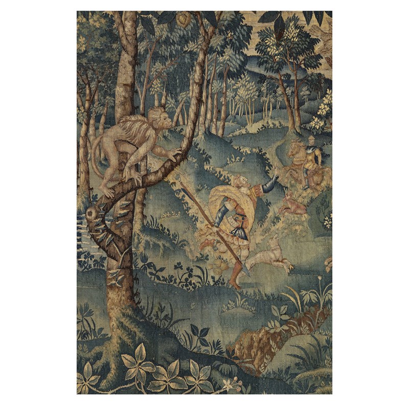 raffigurante scena di caccia con figure a cavallo con mastini nella foresta con servitori che suonano corni, provenienti da una palazzina di caccia sullo sfondo a destra, sui rami degli alberi si vedono gufi, fagiani, formichieri, scimmie, pappagalli; le bordure sono interamente decorate a motivi fogliacei, mascheroni, fiori e baldacchini con personaggi negli angoli inferiori; l'arazzo reca traccia di marca sulla bordura in basso a destra, cm 282x390