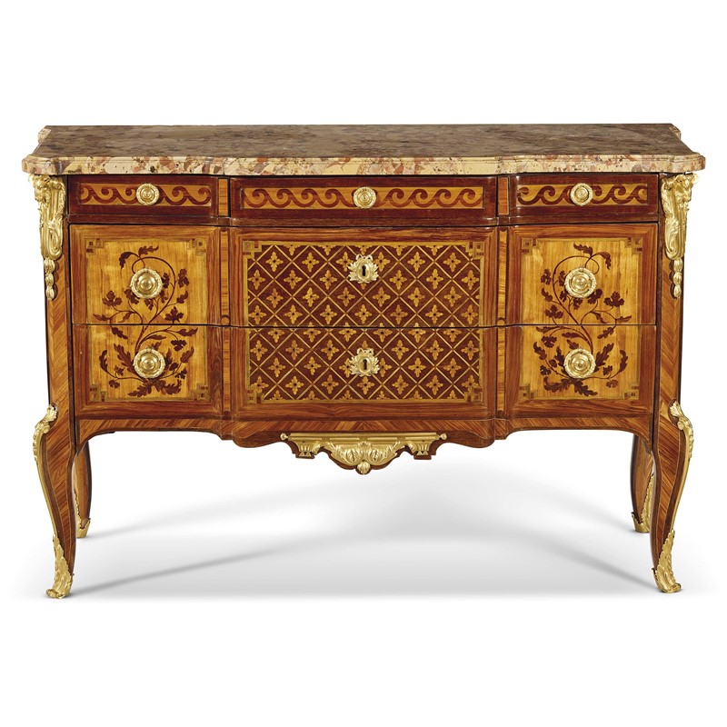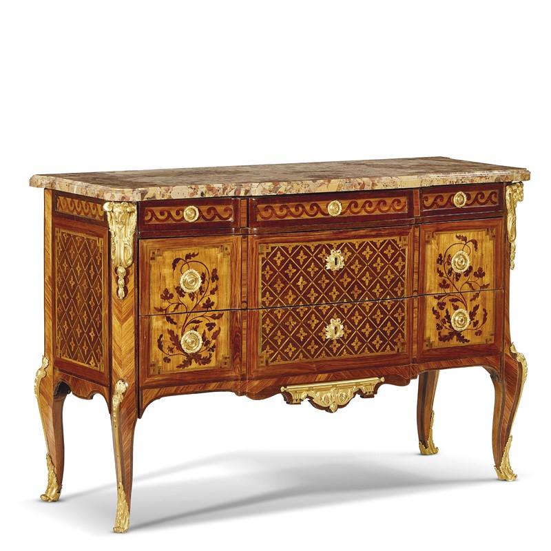 CASSETTONE, FRANCIA, SECONDA METÀ SECOLO XVIII intarsiato in legni pregiati e con applicazioni in bronzo dorato e piano in breccia d'Aleppo, sorretto da piccola fascia con tre cassetti decorati con motivo a onde ricorrenti; due grandi cassetti decorati con motivi geometrici e floreali, ricche applicazioni in bronzo dorato in foggia di ariete sui montanti laterali, cm 90x137x52