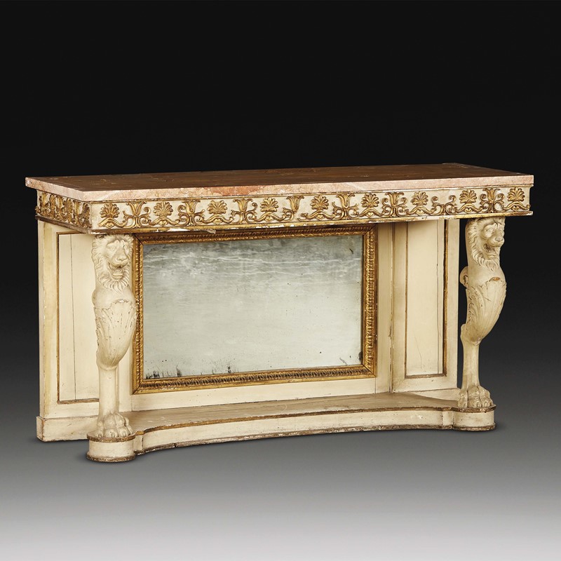 in legno laccato e dorato, piano in marmo sotteso da fascia con decori dorati a palmette e vasi fioriti, sostenuto da montanti anteriori in foggia di teste leonine terminanti in grande zampa, la parte parietale inferiore arricchita da specchiera, su base di linea sagomata, cm 90x162x57,5