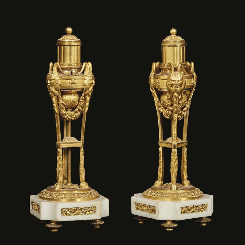 COPPIA DI CANDELIERI, FRANCIA, PRIMA META SECOLO XIX in forma di atheniennes, in bronzo dorato con piccoli coperchi girevoli a formare bobeches, su basi in marmo bianco, piedi a trottola, alt. cm 25