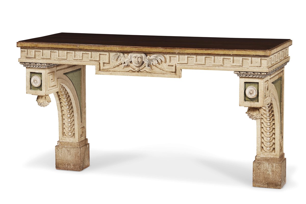 COPPIA DI CONSOLES, ITALIA CENTRALE, SECONDA METÀ SECOLO XVIII in legno dipinto e intagliato, piano sotteso da fascia di linea spezzata decorata con greca e testa di gorgone centrale, le gambe curvilinee recano decoro circolare entro dado, cm 90x160x60,5