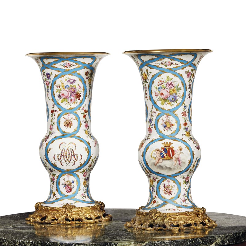 in porcellana policroma e parzialmente dorata poggiante su base in bronzo dorato, recanti al centro stemma della famiglia Torlonia e Colonna, sotto la base firmato Rihouet à Paris, alt. cm 50, diam. 27