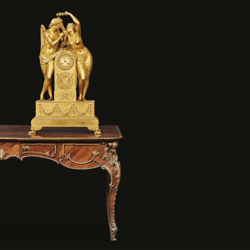 GRANDE OROLOGIO, FRANCIA, PRIMO QUARTO SECOLO XIX in bronzo dorato, cassa a piedistallo nella quale si inserisce il quadrante di forma circolare con numeri arabi e doppio foro di carica firmato in basso GITEAU PALAIS ROYAL N. 110 sottesa da fregio Impero a due torce incrociate entro una lira sotto al quale due cigni inquadrano un vaso, alla quale si appoggia Psiche in atto di incoronare Amore con una ghirlanda di rose, su base a parallelepipedo ornata da decoro a torce collegate da festoni sotteso da cornice a palmette e terminante in piedini a zampa leonina, due tiretti su ogni lato per il trasporto, cm 96x57x29