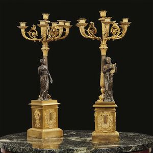 COPPIA DI CANDELABRI, FRANCIA, INIZIO SECOLO XIX in bronzo cesellato brunito e dorato, a sei luci su tripode con [..]