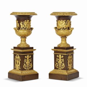 COPPIA DI VASI, FRANCIA, PRIMA META SECOLO XIX bronzo brunito e dorato, decorato sul corpo con scene classiche, [..]