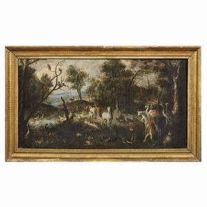 Pittore fiammingo, secolo XVII PAESAGGIO CON FIGURA E ANIMALI IN UN BOSCO cm 40x74,5 Flemish painter, 17th century [..]