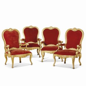 QUATTRO POLTRONE, ROMA, SECOLO XVIII in legno intagliato e dorato, con seduta, schienale e braccioli in velluto [..]