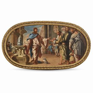 Scuola romana, seconda metà secolo XVII COPPIA DI DIPINTI GESÙ SCACCIA I MERCANTI DAL TEMPIO IL [..]