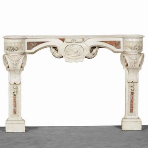 CAMINO, ITALIA SETTENTRIONALE, SECOLO XIX in marmo bianco con inserti in marmo rosso, piano con medaglione centrale [..]