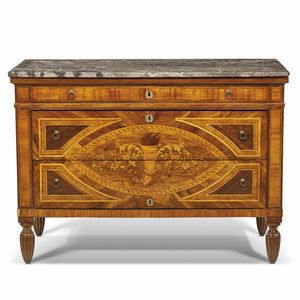CASSETTONE, BOTTEGA DI GIUSEPPE MAGGIOLINI, LOMBARDIA, FINE SECOLO XVIII intarsiato in legni pregiati, piano in [..]
