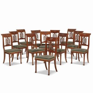 GRUPPO DI DODICI SEDIE, FRANCIA, FINE SECOLO XVIII in legno di mogano, lo schienale lavorato a giorno con motivo [..]