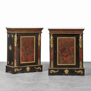 COPPIA DI CREDENZE IN STILE BOULLE, FRANCIA, SECOLO XIX il piano in marmo bianco sotteso da fascia in marqueterie [..]