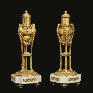 COPPIA DI CANDELIERI, FRANCIA, PRIMA META SECOLO XIX in forma di atheniennes, in bronzo dorato con piccoli coperchi [..]