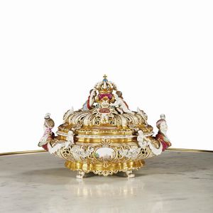 ZUPPIERA, MANIFATTURA DI MEISSEN, METÀ SECOLO XIX di forma ovale in porcellana policroma e dorata, realizzata [..]
