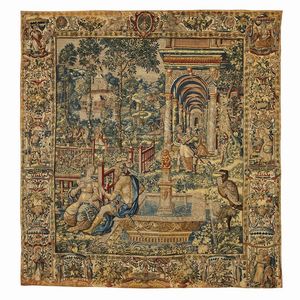 ARAZZO, MANIFATTURA DI BRUXELLES, SECOLO XVI raffigurante in basso a sinistra una scena galante con una fontana [..]