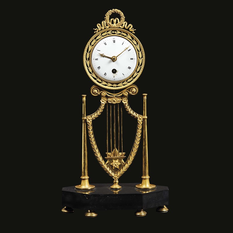 in bronzo dorato, quadrante circolare sormontato da corona di fiori, con numeri romani per le ore e arabi per i minuti e pendolo terminante in decoro a stella, sostenuto da motivo a lira affiancato da coppia di trombe, su base ottagonale in marmo e piedi a cipolla, cm 36x18,5x9,5