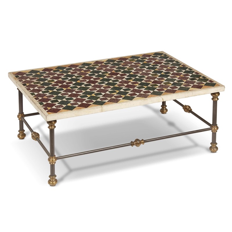 in marmo intarsiato a motivi geometrici in porfido rosso e porfido verde, poggiante su base moderna in ferro, misure piano cm 106x80,5, con tavolino alt. cm 43