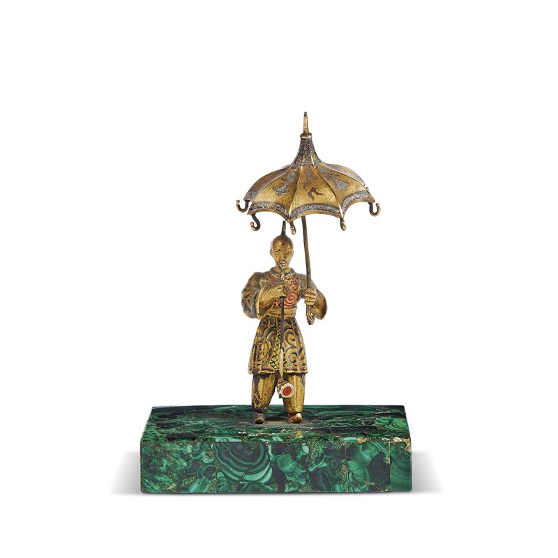 in bronzo dorato su base in malachite, rappresentante figura orientale con ombrellino girevole e lunga pipa, cm 13,5x9,5x6,8
