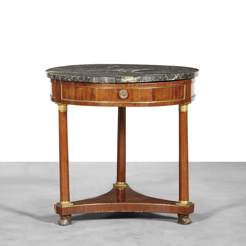di forma circolare, in legno chiaro con montature in bronzo dorato e piano in marmo verde, su fascia a un cassetto, sostenuta da tre gambe tornite poggianti su base sagomata, piedi ferini, alt. cm 80, diam. cm 83