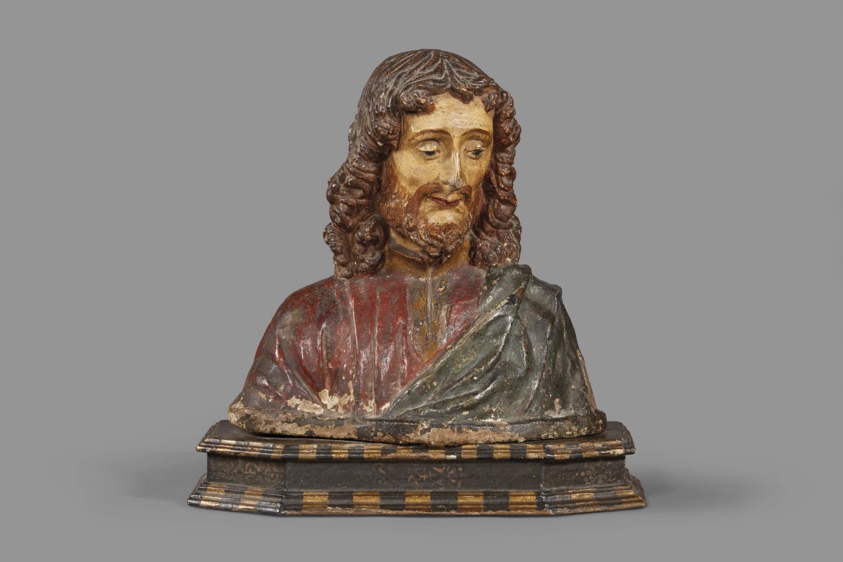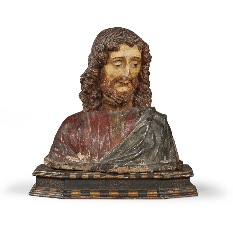 Andrea Ferrucci and workshop, Fiesole, circa 1465-1526, Christ the Redeemer, 45x46x25 cm, polychromed stucco bust and black lacquered and gold highlighted wood base (9x55x23 cm)