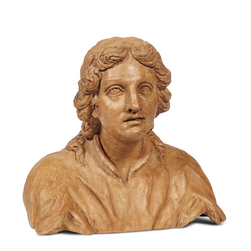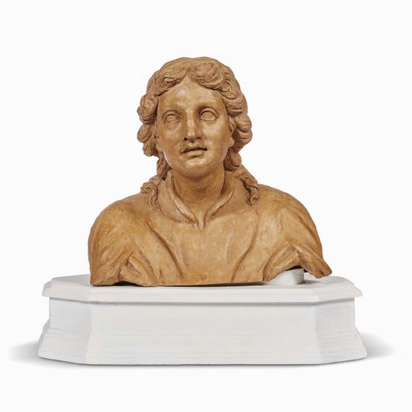 La prima attestazione nota di Angelo di Mariano risale al 1506 all’interno del cantiere del Duomo di Siena al fianco del fratello Lorenzo di Mariano Marrini, meglio conosciuto come “il Marrina”, mentre la sua prima opera nota è stata invece riconosciuta nel Cristo in pietà sorretto da Angeli, scolpito all’interno del grande complesso d’altare per la chiesa di Santa Maria in Fontegiusta commissionato al fratello Lorenzo e realizzato tra il 1509 e il 1520 […] Angelo già dal 1519 risulta attivo Roma al seguito di Baldassarre Peruzzi, coinvolto nei principali circuiti della committenza papale. Nell’Urbe risulta documentato, insieme ad altri due fratelli, Lodovico e Tibaldo, nella decorazione scultorea della cappella del Re di Francia in San Pietro (entro il 1521), dal 1522 assieme al solo Lodovico nella sepoltura del cardinale Francesco Armellini in Santa Maria in Trastevere mentre più tardi (1524), da solo, ottiene la prestigiosissima commissione della tomba di papa Adriano VI - opera progettata da Baldassarre Peruzzi e commissionata dal cardinale Willem van Enckenvort - per la chiesa della nazione tedesca a Roma, Santa Maria dell’Anima (Angelini 1998; Fattorini 2005, pp. 560-572). Il nostro Angelo, parte originariamente di un gruppo raffigurante l’Annunciazione, uno dei soggetti religiosi più apprezzati in ambito senese su cui più volte si era impegnato anche il fratello Marrina, si distingue dal resto della produzione fittile coeva per la complessità esecutiva e la variante iconografica suggerita dal taglio della figura e dalla conformazione del tergo. La figura risulta infatti tagliata appena sotto le spalle, con i lembi di stoffa della veste che, risolvendosi in eleganti risvolti, non lasciano presupporre l’applicazione della figura ad un'altra sezione di corpo a comporre una figura intera; tale conformazione lascerebbe invece propendere per una sua originaria collocazione su una preziosa base lignea, dipinta e dorata, a pendant di un analogo busto della Vergine annunciata. Sul retro invece la scultura presenta due cavità regolari che ne permettevano l’applicazione di ali, eseguite con materiali differenti, probabilmente in sottile lamina metallica, smaltata, dorata e dipinta, oppure in cartapesta, più leggere e ugualmente predisposte a sostenere una preziosa policromia, realizzate con la partecipazione di un orafo o di un pittore locale, cui sarebbe spettata anche la cromia delle figure. L’apporto naturalistico e il preziosismo delle dorature delle vesti doveva raggiungere gli stessi esito oggi percepibili nella Santa Caterina di Siena o nei due straordinari San Pietro e Paolo di Pienza eseguiti dal fratello Marrina