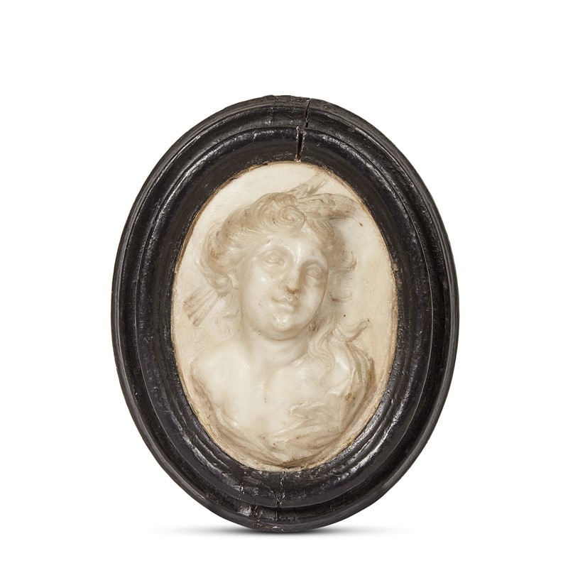due rilievi ovali in marmo bianco entro cornice in legno ebanizzato, cm 23x15,5x4,8 (ciascuna)