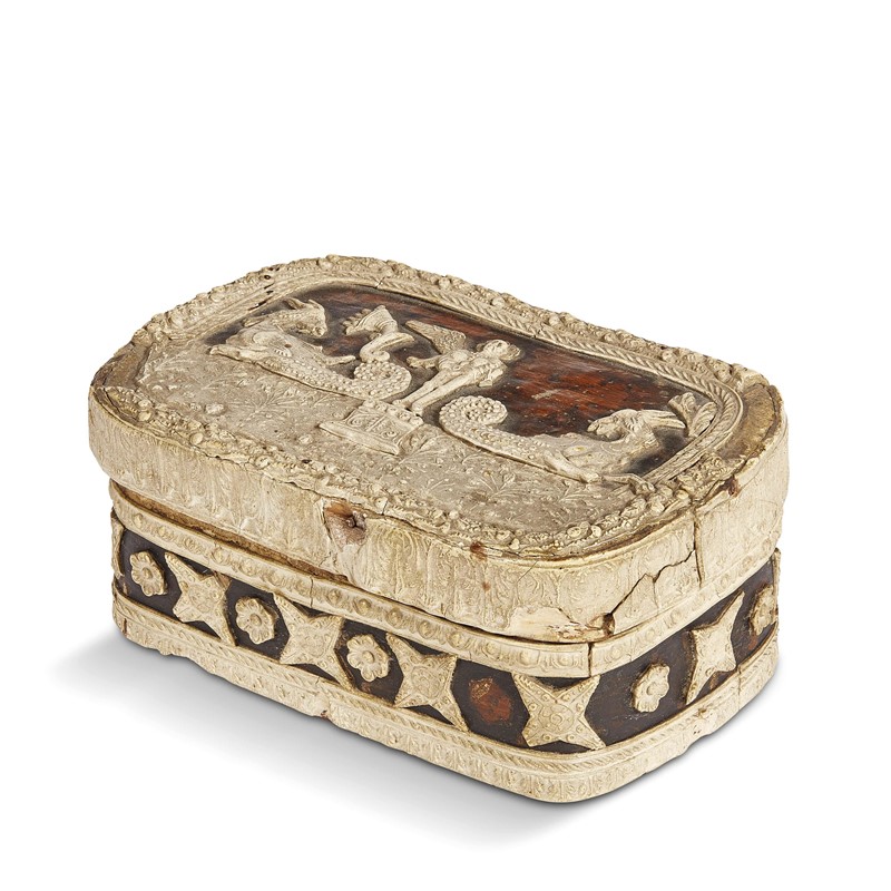 in legno e pastiglia, raffigurante sul coperchio allegoria della Vittoria affiancata da caproni addorsati su giardino, arricchito da bordo ornato da festoni e foglie d’acanto; la fascia della scatola ornata da motivi floreali stilizzati, cm 3,8x13x6
