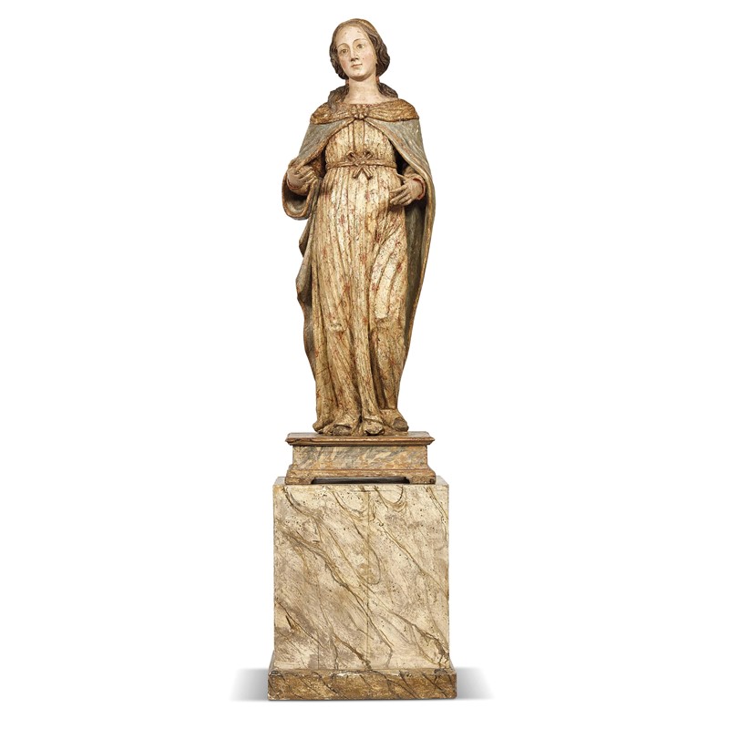 Northern Italian, 16th century, The Virgin announced, carved and painted wood,133x47x43 cm, on a wooden marble-like painted base (base 60x53x53 cm)