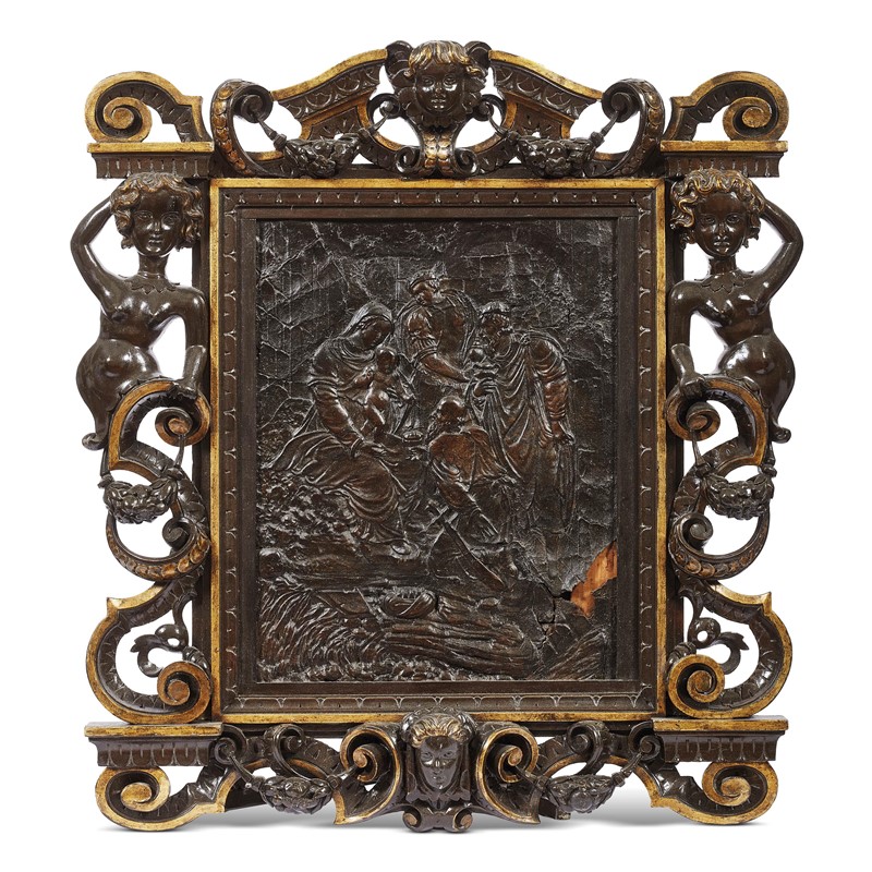 Northern Italian, 17th century, Adoration of the Magi, leather within a Sansovino-style frame, 35x44 cm (with frame 67x75 cm)