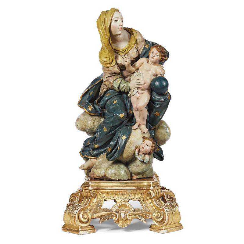 gruppo in terracotta dipinta in policromia, raffigurante la Madonna col Bambino in braccio seduta su un cuscino di nuvole dalle quali spunta una testa di cherubino alato, cm 42,5x23x19; completa di base in legno intagliato e dorato, cm 13x31x31