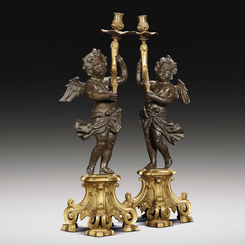Roman, late 17th century, A pair of putti holding chandeliers with floral motifs and bobeches, 53,5x17,5x16 cm