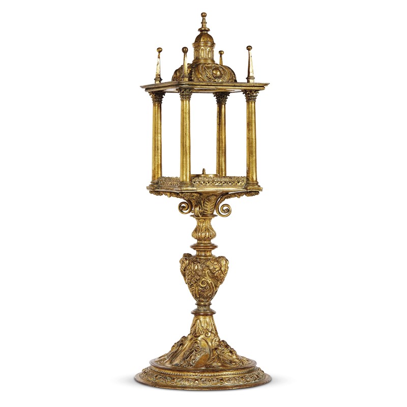 in rame bronzo dorato, base circolare decorata con figure di due santi alternati a due puttini, fusto sagomato con nodo piriforme impreziosito da volti di cherubini a rilievo su motivi vegetali, parte superiore a giorno con quattro colonnine con capitello corinzio a sostenere pianetto con quattro pinnacoli centrati da cupola sbalzata; alt. cm 40, diam. piede cm 14,5