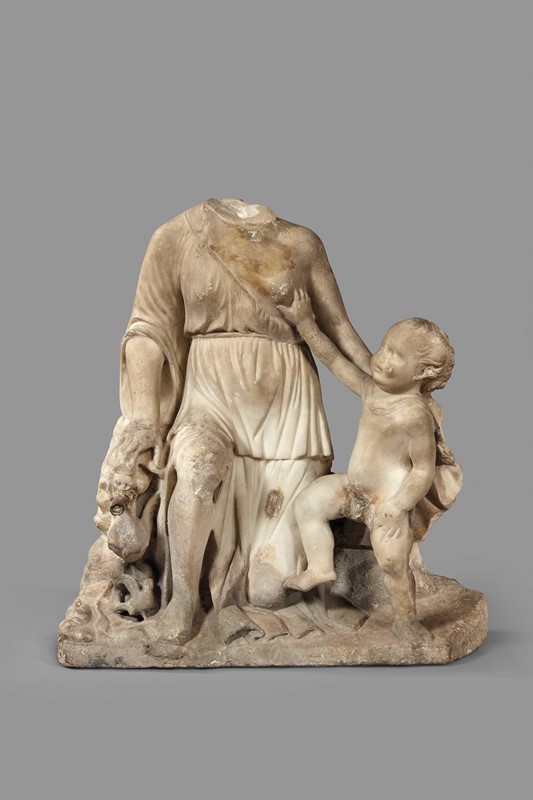 Tuscan-Roman sculptor active in the circle of the ‘Maestro di Pio II’, second half 15th century, Allegory of Charity, white marble group, 72x67x37 cm
