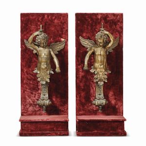 Roma, fine secolo XVII COPPIA DI PUTTI in bronzo patinato e dorato, a reggere candelieri con motivi vegetali [..]