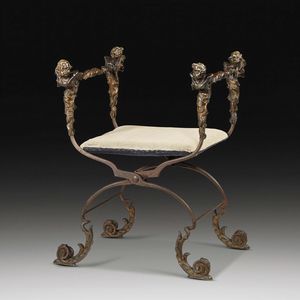 Roma, 1750 circa FALDISTORIO in ferro, bronzo e bronzo parzialmente dorato, a doppia tenaglia incernierata collegata [..]