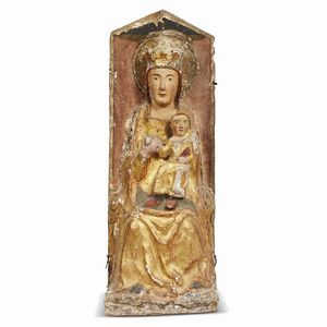 Scuola umbra, secolo XIV MADONNA IN TRONO CON BAMBINO in legno e materiali compositi policroma, cm 93x35x21,5 [..]