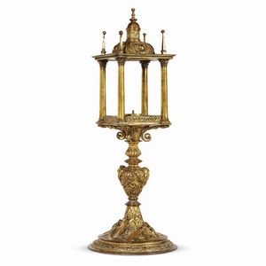 Roma, inizi secolo XVII RELIQUIARIO in rame bronzo dorato, base circolare decorata con figure di due santi alternati [..]