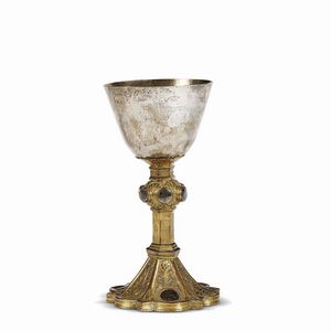 Lombardia, fine secolo XIV CALICE in rame cesellato, inciso e dorato. Base a pianta mistilinea esagonale con costolature [..]