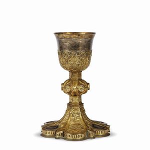 Lombardia, fine secolo XV CALICE in rame cesellato, inciso e dorato. Base a pianta mistilinea esagonale con costolature [..]