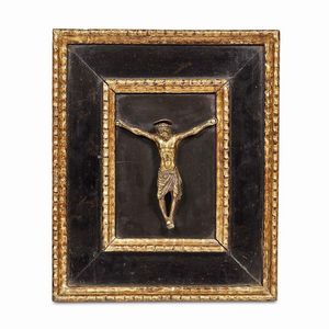 Italia Settentrionale, secolo XVI CROCIFISSO in bronzo dorato, cm 14x10, montato su supporto ligneo non coevo [..]