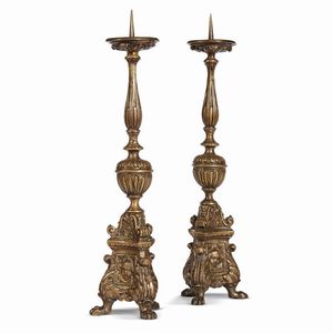 Veneto, inizi secolo XVII COPPIA DI CANDELIERI in bronzo dorato, di forma classica con base tripode su zampe ferine [..]