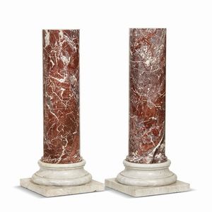 Italia, secolo XIX COPPIA DI COLONNE PORTABUSTO in marmo rosso venato su base quadrangolare in marmo bianco, cm [..]