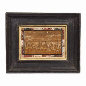 Firenze, seconda metà secolo XIX PLACCA in pietra paesina contornata da cornice in pietre dure, cm 15,5x21, [..]