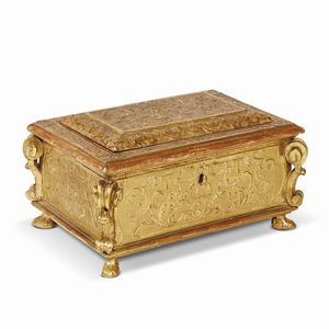 Toscana, secolo XIX COFANETTO in legno intagliato e dorato con decori a rilievo; sul coperchio stemma con corona [..]